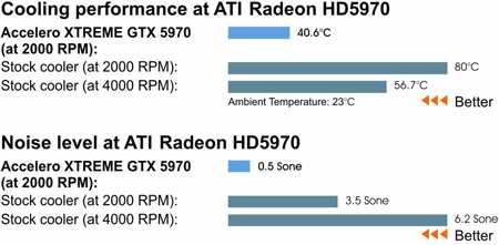 Potwierdza to i dziś wprowadzając na rynek bez dwóch zdań najpotężniejsze, a zarazem najwydajniejsze coolery VGA, jakie ujrzały dotychczas światło dzienne. Co ciekawe, coolery te przeznaczone są tylko i wyłącznie dla jednego układu graficznego, który odpowiada symbolowi w nazwie. Jeden z nich - Accelero Xtreme 5970 kompatybilny jest z najwydajniejszym układem graficznym świata, mianowicie ATI Radeon HD 5970. Analogicznie Accelero Xtreme 5870 przeznaczony jest dla kart z rodziny ATI Radeon HD 5870.