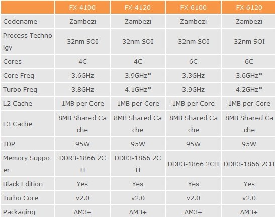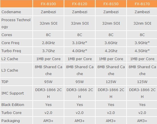 Wszystkie procesory o nazwie kodowej Zambezi zostaną wykonane w technologii 32 nm. Szczegółową specyfikację przedstawiono niżej.