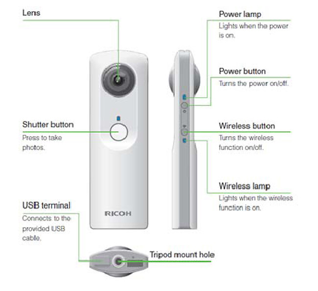 Sam aparat jest również niezależnym urządzeniem posiadającym 4GB pamięci, która wg zapewnień Ricoh pozwala na zrobienie 1200 zdjęć. Theta samodzielnie dobiera ustawiania ekspozycji, ISO, czas otwarcia migawki czy balans bieli.