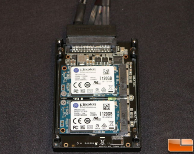 HyperXpress SSD interfejs SATA Express. Wewnątrz znajdują się dwa złącza mSATA 6 Gb/s połączone w RAID 0 zbudowane w oparciu o kontroler ASMedia.