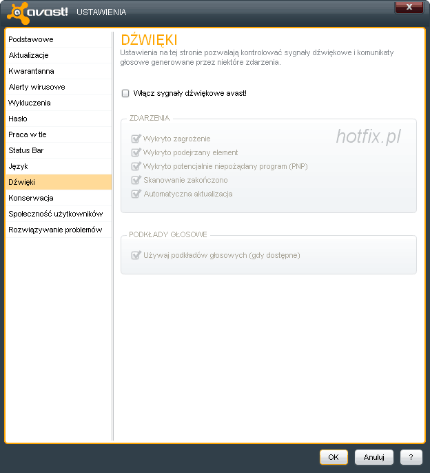Zapewne bardzo wielu użytkowników użyje tej opcji i wyłączy wszystkie dźwięki w ustawieniach. Więc aby nie słyszeć przez głośniki informacji, że np aktualizacja została przeprowadzona itd możemy wszystko wyłączyć odhaczając "Włącz sygnały dźwiękowe avast!". Także wszystko z osobna można wyłączyć.