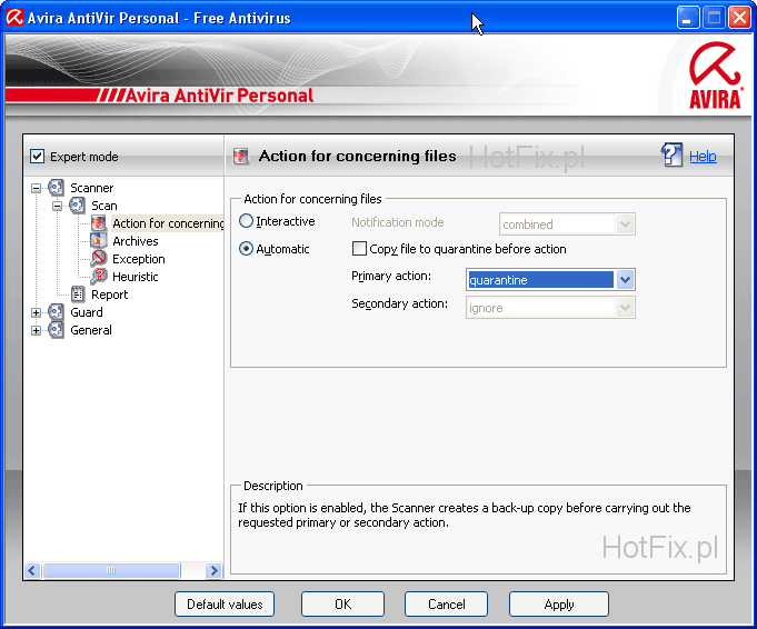 W sekcji Action for concerning files możemy wybrać, jakie antywirus ma podjąć działanie po znalezieniu wirusa (gdy wybierzemy skanowanie na żądanie, opcja ta nie dotyczy ochrony w czasie rzeczywistym). Domyślnie zaznaczona jest opcja Interactive. Oznacza to, że Avira za każdym znalezieniem wirusa wyświetli okienko z zapytaniem, co z nim zrobić. Możemy jednak ułatwić sobie to zadanie i wybrać opcję Automatic a następnie z listy Primary action wybrać opcję Quarantine. Po tym ustawieniu Avira będzie przenosiła znalezione wirusy do kwarantanny.