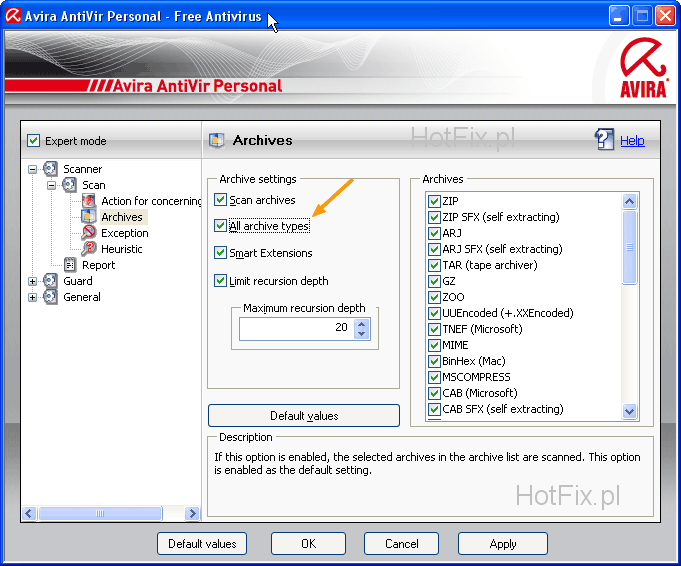 Tutaj jedynie po wejściu w zakładkę Archives zaznaczamy opcję All archive types. Oznacza to, że wszelkiego typu archiwa będą skanowane.