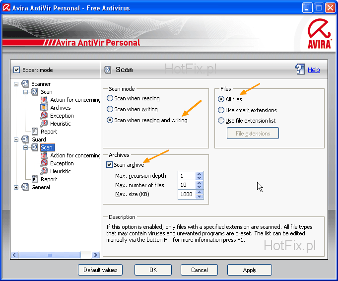 Przechodzimy do sekcji Guard -> Scan i zaznaczamy All files oraz Scan archive:
