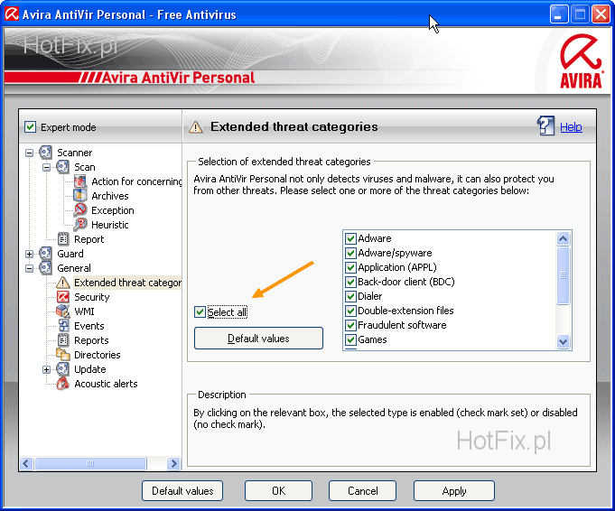 Teraz ustawmy, aby Avira skanowała wszystkie typy zagrożenia. W tym celu przechodzimy do sekcji General i zaznaczamy opcję Select all: