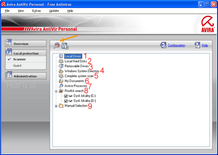 Avira daje nam do wyboru kilka opcji skanowania różnych obszarów systemu. W sekcji Local protection (Ochrona lokalna) wybieramy opcję Scanner: