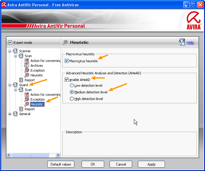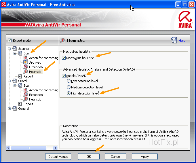 UWAGA! Użytkownicy początkujący powinni ustawić czułość skanera na Mednium a nie na High. Jednak, gdy posiadamy odpowiednią wiedzę i chcemy, aby skanowanie plików było dokładniejsze (a przy tym najczęściej wolniejsze), możemy spokojnie przełączyć na High. Opcję tę można również zmienić w samej Avirze (patrz niżej: Konfiguracja antywirusa Avira).