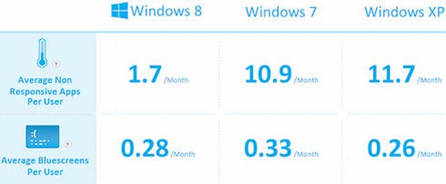 Wg statystyk przedstawionych przez Microsoft, w najnowszym systemie Windows 8 szansa ujrzenia niebieskiego ekranu śmierci wynosi, zaledwie 0,28 procenta, a w Windows 7 wynosi 0,33 procenta.