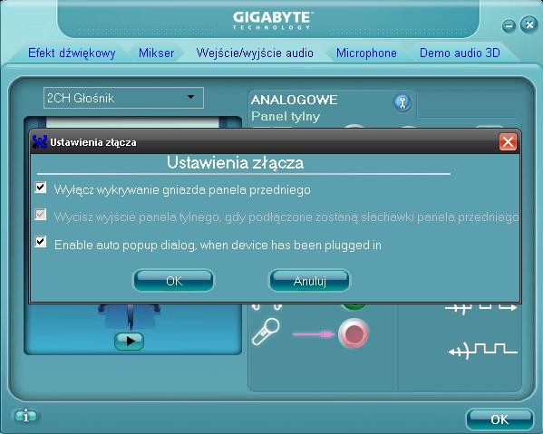 v Wyłącz wykrywanie gniazda panela przedniego - OK.