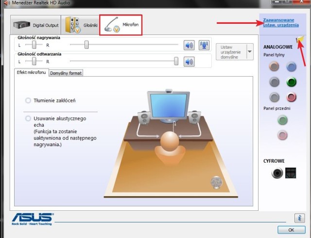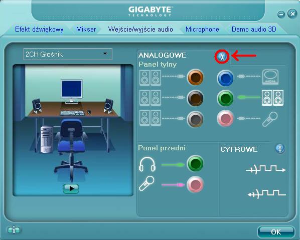 2. W zakładce Wejście/wyjście audio -> ANALOGOWE klikamy obok na mały ,,kluczyk" i zaznaczamy