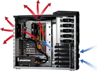 Wewnątrz raczej nic zaskakującego, jak to było na przykład w przypadku Cosmos Black Edition. "Nic zaskakującego" nie oznacza, że konstrukcja wnętrza jest fatalna. Po prostu taki schemat mogliśmy już spotkać w innych konkurencyjnych obudowach, jak również w obudowach od CoolerMaster. Ważniejsze cechy wnętrza to: dolne umiejscowienie zasilacza, pięć poziomych zatok 3,25" na bezmontażową instalację dysków twardych i siedem śledzi na karty rozszerzeń (karty graficzne, tunery TV itp). Dodatkowo - spoglądając na tylną ściankę obudowy zauważymy na górze dwa niewielkie otwory, których krawędzie zabezpieczone są gumą. Otwory te pozwalają na wprowadzenie do wnętrza CoolerMaster HAF 922 dwóch przewodów systemu chłodzenia cieczą. A pozostając przy chłodzeniu - ów zagadnienie jest niezbitym atutem obudowy HAF 922. W tej dziedzinie jest ona niemalże bezkonkurencyjna. Cóż się dziwić, w końcu to produkt od CoolerMaster - "Mistrza chłodzenia" ;) W skład systemu chłodzenia obudowy wchodzą: