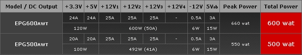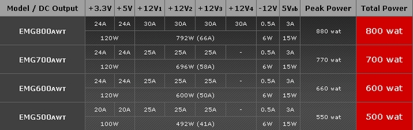 Odsłona Enermax Modu87+ liczy cztery modele zasilaczy o maksymalnej ciągłej mocy szczytowej: 500W (EMG500AWT), 600W (EMG600AWT), 700W (EMG700AWT), 800W (EMG800AWT), zaś seria Enermax Pro87+ jest mniej pokaźna i zawiera dwa modele: 500W (EPG500AWT) oraz 600W (EPG600AWT).