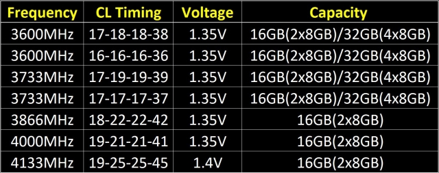 W rodzinie TridentZ można zobaczyć moduły 3600, 3733, 3866, 4000 oraz 4133 MHz. Te najwydajniejsze pracują przy timmingach 19-25-25-45 oraz napięciu 1.4V. Pozostałe moduły zaprezentowano w tabelce niżej.