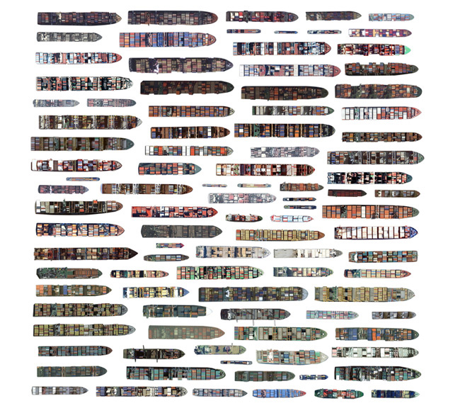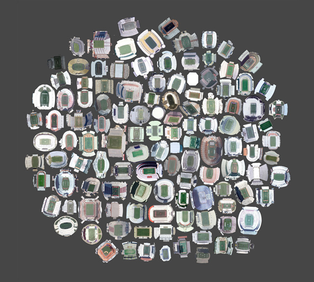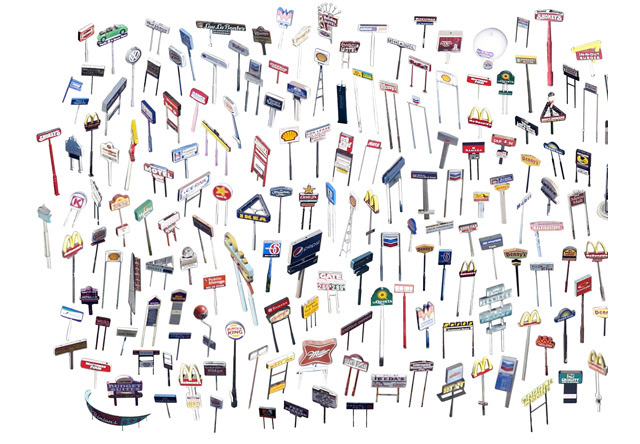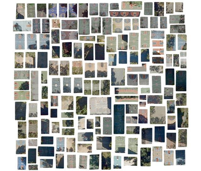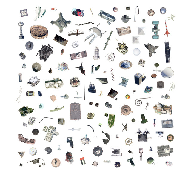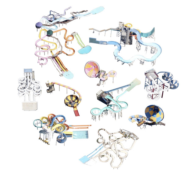 Autora postanowiła ukazać na białym tle zestaw podobnych obiektów wyciętych z Google Map. Efekcie możemy podziwiać aqua parki, przydrożne znaki reklamowe, puste parkingi czy boiska sportowe.