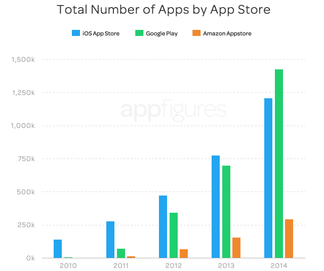 Obecnie liczba wszystkich aplikacji w Google Play wynosi 1,43 miliona na koniec roku 2014. Natomiast główny konkurent może pochwalić się tylko 1,21 miliona aplikacji.
