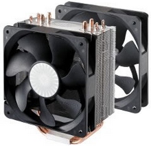 Bezpośrednim łącznikiem CoolerMaster Hyper 212 Plus z procesorem jest aluminiowo miedziana baza. Elementem miedzianym są rurki cieplne heat-pipe spłaszczone w tym miejscu, które zdecydowanie usprawniają odbieranie ciepła z procesora. Miedzianych ciepłowodów jest cztery, co efektywnie daje osiem rurek, będących jednocześnie wspornikami aluminiowego, sporych rozmiarów radiatora, zbudowanego z 55 niezwykle ciasno zestawionych ze sobą finów.  W zestawie znajdziemy dwa ogromne 120 milimetrowe wolnoobrotowe wentylatory o automatycznie regulowanym przez funkcję PWM zakresie obrotów - 600 - 2000 obr./minutę. Maksymalna wydajność jednego wentylatora w przepływie powietrza wynosi aż 125 m³/godzinę przy szczytowym hałasie sięgającym 31dB(A). Przy niewielkim obciążeniu procesora, gdy wentylator pracuje na najniższych obrotach, generuje niesłyszalny wręcz hałas o natężeniu 13dB(A). Ich żywotność oszacowano na 40,000 godzin pracy. CoolerMaster Hyper 212 Plus waży zaledwie 626 gram i poradzi sobie bez problemu w najbardziej stresujących dla procesora momentach, również przy jego sporym overclockingu.