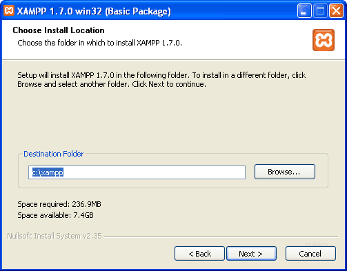 c) Wskazujemy lokalizację (docelowy katalog), w którym będzie zainstalowany XAMPP. Jeżeli chcemy zmienić ścieżkę, klikamy na Browse..., wskazujemy inny katalog i potwierdzamy OK. Proponuję pozostawić domyślny katalog czyli C:\xampp. Aby przejść do kolejnego etapu klikamy Next.