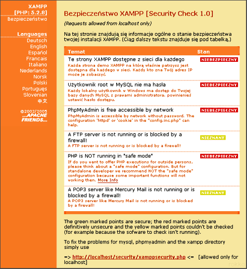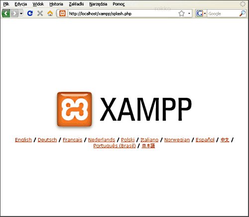a) Otwieramy przeglądarkę i w pasku adresu wpisujemy localhost lub 127.0.0.1 Wyświetlona zostanie strona powitalna, która pozwoli na wybór języka. Po przeprowadzeniu tej operacji serwer jest gotowy do użycia, jednakże z różnych względów wskazane jest zabezpieczenie dostępu do niego.