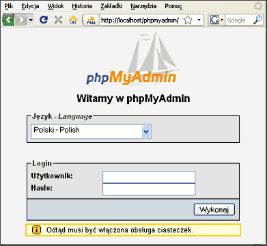 a) Wybieramy z menu po lewej phpMyAdmin bądź wpisujemy w pasek adresu localhost/phpmyadmin. Naszym oczom ukaże się strona powitalna phpMyAdmina, na której dokonujemy autoryzacji. Wpisujemy nazwę użytkownika, domyślnie root oraz hasło, które założyliśmy we wcześniejszym kroku, po czym klikamy Wykonaj.