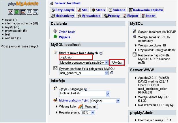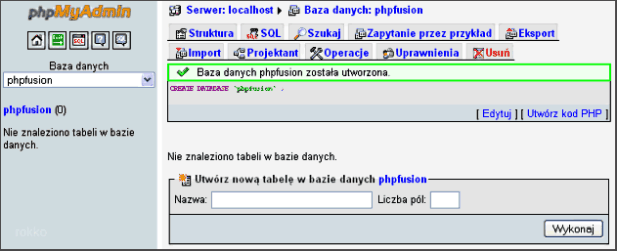 b) Przystępujemy do utworzenia nowej bazy danych pod naszego CMS-a. W tym celu w polu Utwórz nową bazę danych wpisujemy nazwę bazy np. phpfusion i klikamy na Utwórz. Otrzymamy komunikat Baza danych phpfusion została utworzona. Możemy zauważyć, że w panelu po lewej istnieje baza o nazwie phpfusion, która nie zawiera żadnych tabel. Na tym etapie nic więcej nie musimy wykonywać. Teraz pora zainstalować CMS.