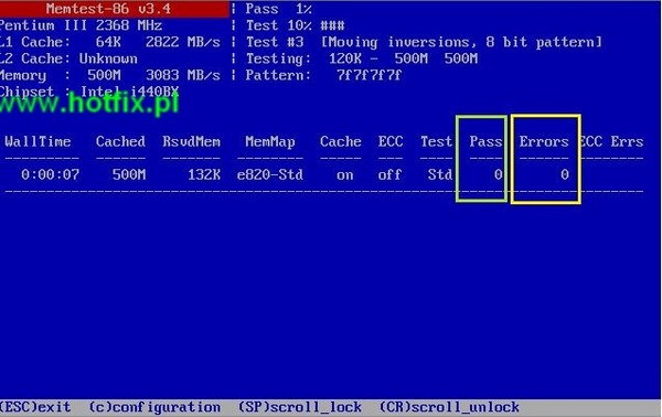 Prawidłowo wykonywany test programem Memtest86+ musi trwać minimum jedno przejście (Pass 1 w zielonej ramce, na rysunku). Ilość znalezionych błędów podawana jest w tabelce w oknie Errors (zaznaczona na żółto). Program sprawdza tak długo pamięć, aż samodzielnie z niego nie wyjdziesz.
