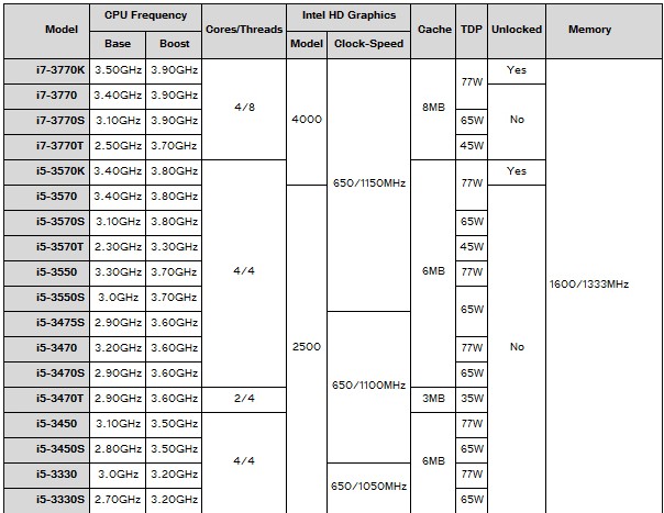 Najsilniejszym układem będzie Core i7-3770K pracujący z zegarem 3,5 GHz, który w trybie Boost przyspieszy nawet do 3.9 GHz. Niewiele wolniejszy będzie Core i7-3770 z zegarem 3.4 GHz (3.9GHz Boost). Najsłabszym modelem będzie Core i5-3330S z zegarem 2.7GHz (3.2 GHz Boost). Resztę pokazuje poniższa tabela.