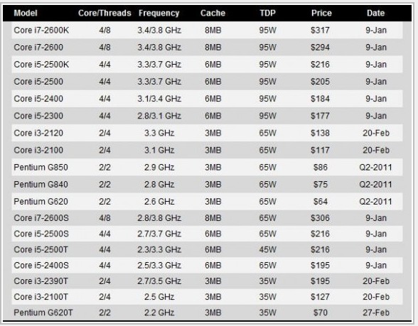 Za najtańszy Pentium G620 przyjdzie zapłacić 64 dolary, zaś za najdroższy Core i7-2600K około 317 dolarów.