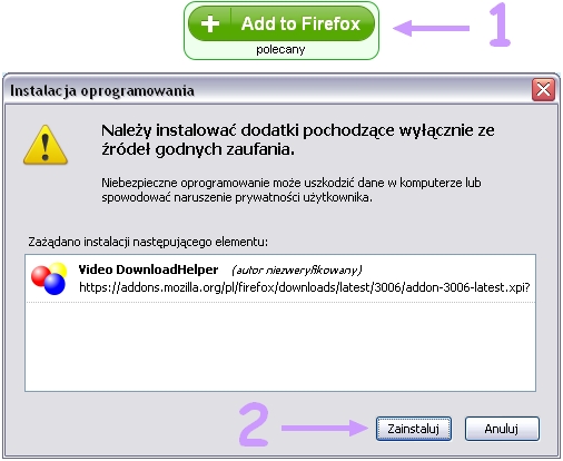 Po przejściu do strony pobierania dodatku klikamy na przycisku 1, po czym w następnie wyświetlonym oknie, po upłynięciu kilku sekund klikamy na "Zainstaluj" (2):