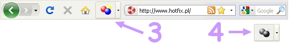 DownloadHelper uwidoczniony jest w oknie przeglądarki po lewej stronie od pasku adresu w postaci ikonki 3. Kolorowa i jednocześnie ruchoma ikonka dodatku informuje o zidentyfikowaniu klipu filmowego na aktualnie przeglądanej stronie internetowej. Ikona czarno biała, nieaktywna (4) informuje o braku klipu na bieżącej stronie, bądź o niezidentyfikowaniu go: