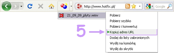 Jeżeli znajdujemy się na stronie, na której umieszczony jest klip który chcemy pobrać na dysk twardy, klikamy na ikonkę DownloadHelpera, wskazujemy nazwę pliku (w naszym przypadku nazwa klipu to "21_09_09.wmv"), automatycznie rozwinie się kolejne menu, z którego wybieramy pozycję "Kopiuj adres URL" (5):