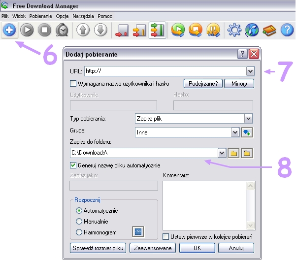 Po uruchomieniu programu, z poziomu jego głównego okna klikamy na niebieskim przycisku "Dodaj pobieranie" (6). W ukazanym oknie wklejamy skopiowany wcześniej bezpośredni adres klipu filmowego w polu tekstowym "URL:" (7).