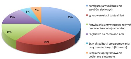 Kolejnym ważnym zjawiskiem są braki w zabezpieczeniach firmwareu (około 5%). Źle monitorowane aktualizacje oprogramowania sprzętowego mogą otwierać luki dla atakujących. Bezwzględnie należy kontrolować aktualność zabezpieczeń routerów, firewalli i wszelkich urządzeń sieciowych.