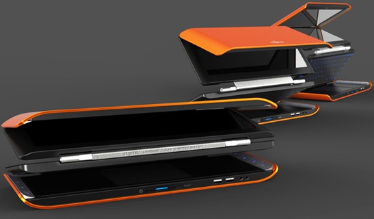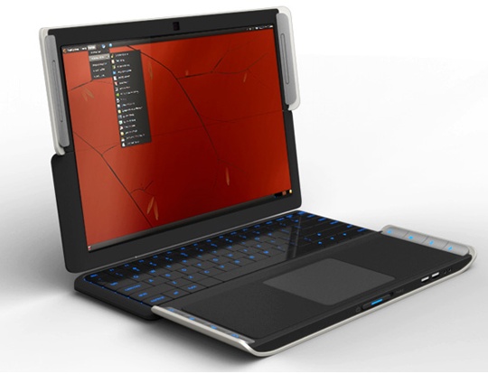 Te przerwy oznaczają jedno, w tych miejscach jest on składany. Dokładnie składany na cztery części. Po złożeniu przypomina on Sony Vaio P i można go zmieścić nawet w torebce żony. Ale z nowu nie jest to klasyczny notebook. Część złożonego ekranu teraz staje się bardzo przyjemną w użyciu klawiaturą dotykową. Dzięki temu powstaje coś na wzór subnotebooka.