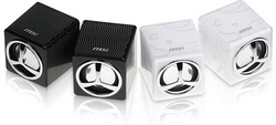 MSI SyrenPhone Mini są malutkimi głośniczkami 2.0 (stereo) opartymi na interfejsie USB, wydanymi w dwóch wersjach kolorystycznych - czarnej i białej. Ich teoretyczne przeznaczenie, to komputery przenośne, ale nie odmówią również współpracy z komputerami klasy PC. Z zewnątrz prezentują się bardzo ładnie - efektu dodatkowo nadają niebieskie diody LED, które podświetlają srebrną wklęśnięta membranę, co efektownie współpracuje z lakierowaną, połyskującą obudową. Jeden głośnik o średnicy 1,5 cala dysponuje mocą 1W ;)