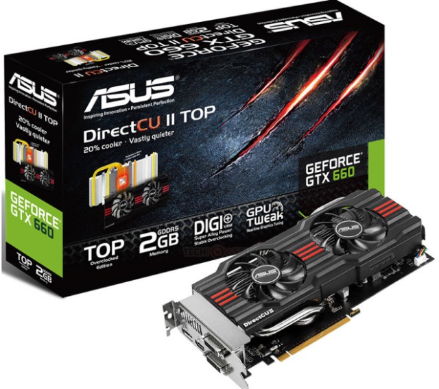 Jedną z ciekawszych propozycji jest karta ASUS GeForce GTX 660 DirectCU II z własnym układem chłodzenia. ASUS tutaj postanowił dzięki temu wprowadzić fabryczne przetaktowanie karty. Tym samym karta ta pracuje z zegarem 1072/1137/6108 MHz dla rdzenia/Boost/pamięć.