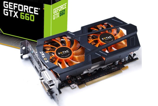 Mocniejszą z kart jest oczywiście GeForce GTX 660 z 960 procesorami strumieniowymi oraz 2GB pamięci GDDR5 na szynie 192 bit. Rdzeń karty pracuje z częstotliwością 980 MHz i w trybie Turbo jest w stanie przyspieszyć do 1033 MHz. Pamięć taktowana jest standardowo 6008 MHz.