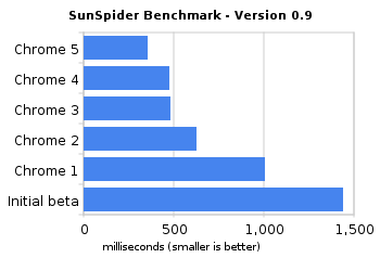 Jak poinformował Google najnowsza beta przeglądarki Chrome 5 jest o około 35% szybsza od wersji stabilnej. Google znacząco zoptymalizował silnik JavaScript - V8 dając mu niezłego kopa. Wydajność ta poprawiła się o 305% porównując pierwsze wersje beta przeglądarki.