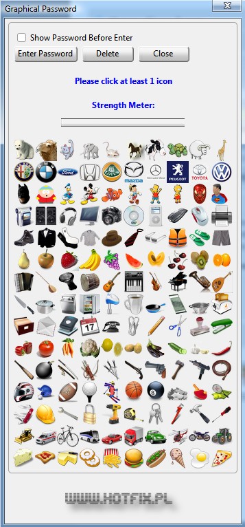 Jak działa GPEX? Uzupełniając formularz rejestracyjny użytkownik dwukrotnie klika lewym przyciskiem myszy w polu przeznaczonym do wpisywania hasła. Zostanie przywołany dodatkowy formularz umożliwiający zastosowanie hasła graficznego. Po wskazaniu jednego lub kilku obrazków (ikon) konstruowany jest ciąg znaków, który posłuży do uwierzytelniania użytkownika w danym serwisie.