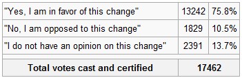 Głosowanie nad zmianami zostało przeprowadzone między dniami 2 kwietnia i 3 maja 2009. Wzięło w nim udział łącznie 18.692 autorów Wikipedii, z czego 17462 głosów było ważnych. W głosowaniu 75% pytanych opowiedziało się za zmianami, 10.5% było przeciw, a 13.7% wstrzymało się od głosów.