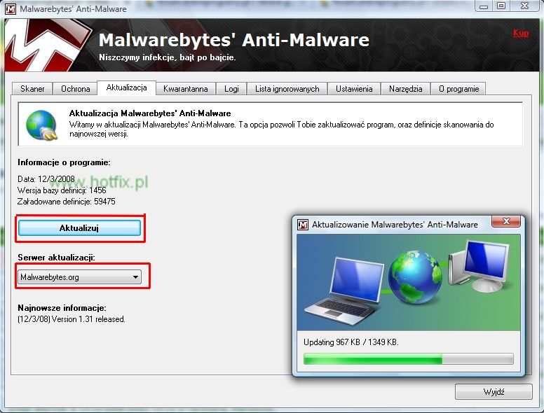 Po uruchomieniu tego programu należy ściągnąć najnowsze aktualizacje. Aby tego dokonać należy przejść do zakładki Aktualizacja, w polu serwer aktualizacji wybrać "Malwarebytes.org", a następnie kliknąć przycisk Aktualizuj.