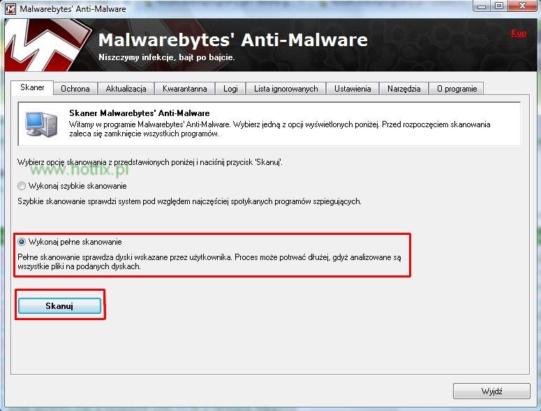 Po wykonaniu aktualizacji można rozpocząć sprawdzanie systemu . Przechodzimy do zakładki Skaner i zaznaczamy Pełne skanowanie, a następnie klikamy przycisk Skanuj.