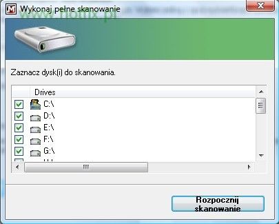 W nowym oknie zaznaczamy wszystkie pola i klikamy Rozpocznij skanowanie.