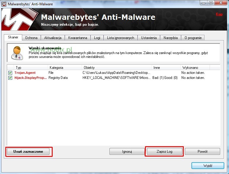 Teraz możemy zachować log ze skanowania poprzez naciśnięcie przycisku Zapisz log . Następnie należy usunąć znalezione infekcje klikając przycisk Usuń zaznaczone. Zwróć najpierw uwagę, czy w oknie wyników skanowania wszystkie opcje były zaznaczone.