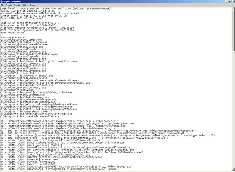 Podczas skanowania RSIT zainstaluje samoczynnie HijackThisa. Po skanowaniu wyskakuje notatnik, log.txt.