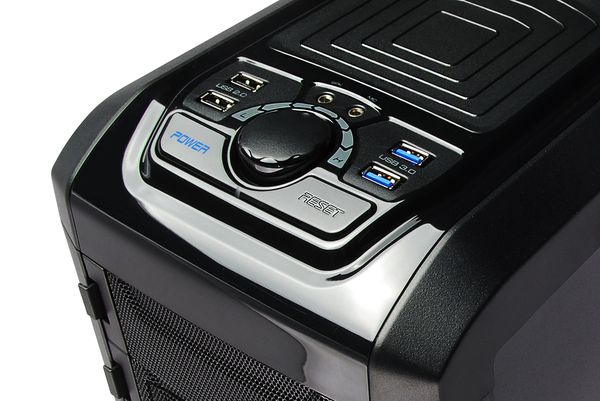 Na przednim panelu znajdują się cztery porty USB w tym dwa USB 3.0, gniazdo mikrofonowe, gniazdo słuchawkowe, 6-kanałowy kontroler obrotów oraz przyciski power i reset. Tuż obok panelu wydzielono miejsce pokryte antypoślizgowym materiałem na smartfona czy zewnętrzny dysk.