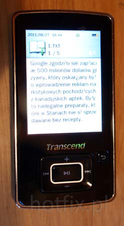 Czytnik e-booków by wyświetlał polskie znaku musi mieć zapisany plik txt w kodowaniu Unicode. Mankamentem jest przenoszenie części wyrazu do nowej linii bez znaku „-”. Poza tymi mankamentami tekst wyświetlany jest w przyjaznej dla oka wielkości czcionki, którą możemy ustawić spośród trzech wielkości. Do czytanego tekstu możemy dodać zakładkę by nie musieć przewijać ponownie tekstu, gdy do niego wrócimy ponownie.