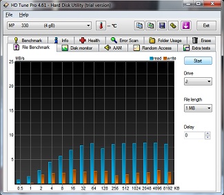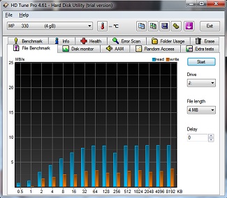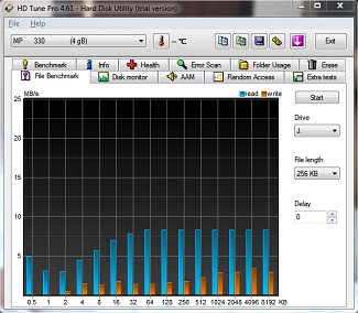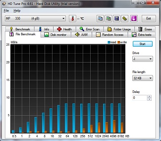 Ja widać na wykresach, MP3 nie należy do demonów szybkości, jeśli chodzi o zastosowania go w roli pamięci flash typu pendrive. Transfer przy małych plikach nie przekracza 10 MB/s dla odczytu i nawet 5 MB/s dla zapisu. A zatem jest to transfer porównywalny dla prostych kart pamięci SD jakie wkładamy do aparatów.
