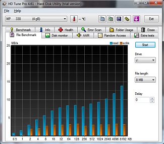 Sytuacja się poprawia dla większych plików. Tutaj odczyt może dochodzić do 13-14 MB/s, a więc zanotujemy gwałtowny wzrost. Tylko, jak często mamy do czynienia z większymi plikami (po 8MB)? Zapis tutaj wydaje się stały, wykresy ani drgną.
