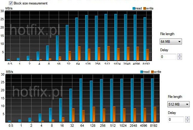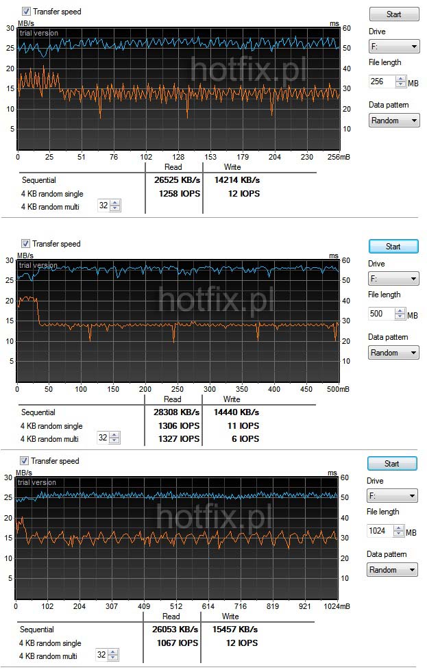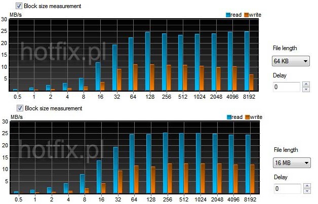 Jak widać to po prostu wahania w transferach. Pendrive możemy uznać, że w pełni spełnia to co nam obiecuje producent i średnie transfery wynoszą 25 MB/s dla odczytu oraz 10 MB/s dla zapisu.