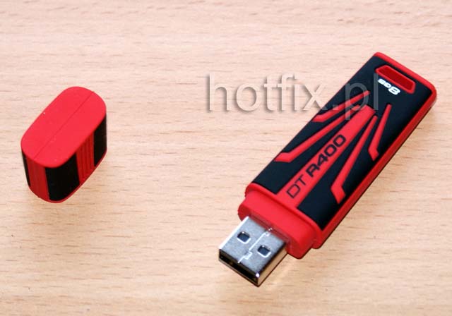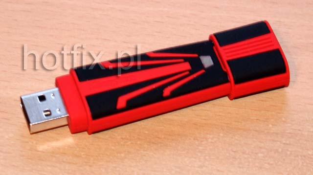 Całe urządzenie pokryte jest 2-3 mm warstwą gumy w kolorze czerwono-czarnym. Jest ona miła w dotyku, pendrive nie ślizga się w dłoniach. Zatyczka trzyma się dobrze, czuć lekki opór przy ściąganiu jej, zatyczkę można umieścić z drugiej strony pendrive’a dzięki czemu nie zgubimy jej. Urządzenie posiada niebieską diodę informującą o transferze danych. Dostępne pojemności 4GB, 8GB, 16GB, 32GB.